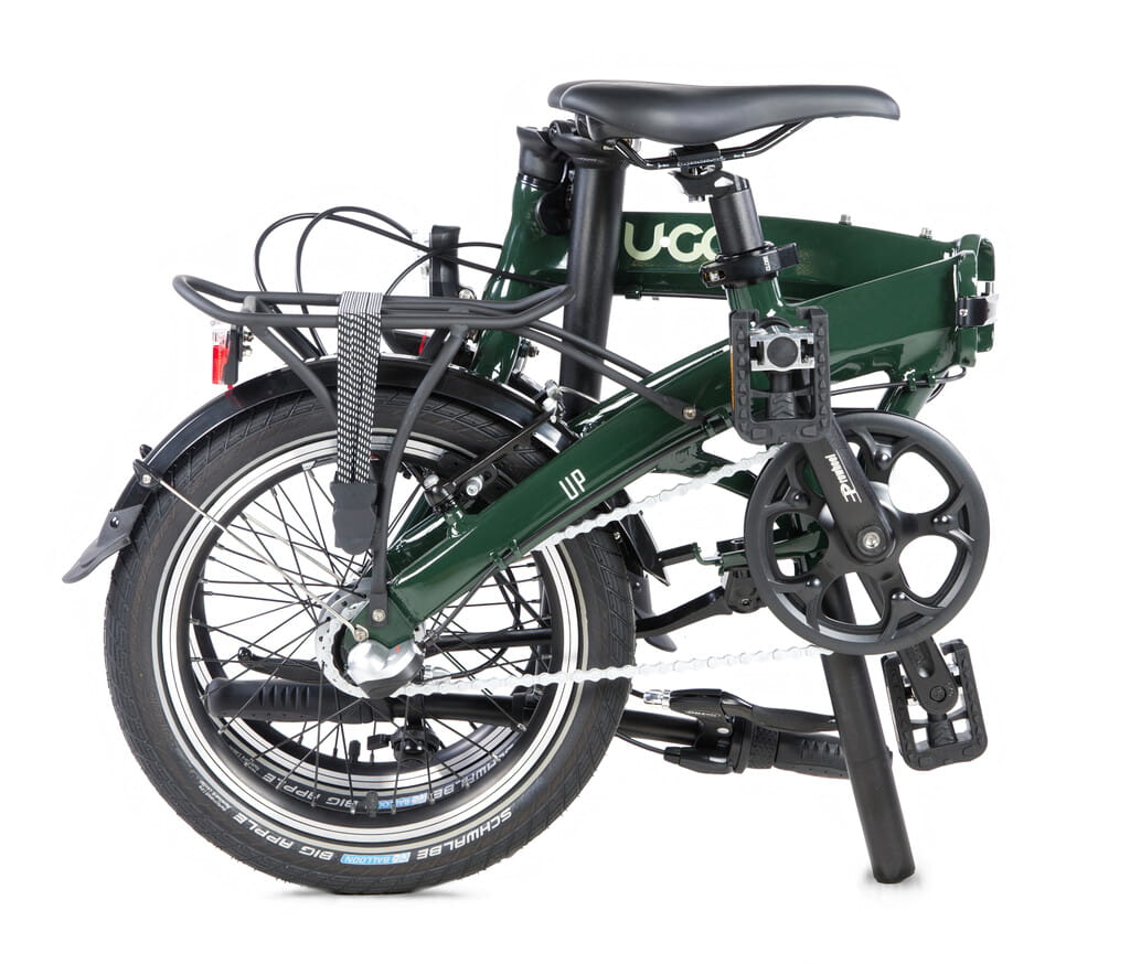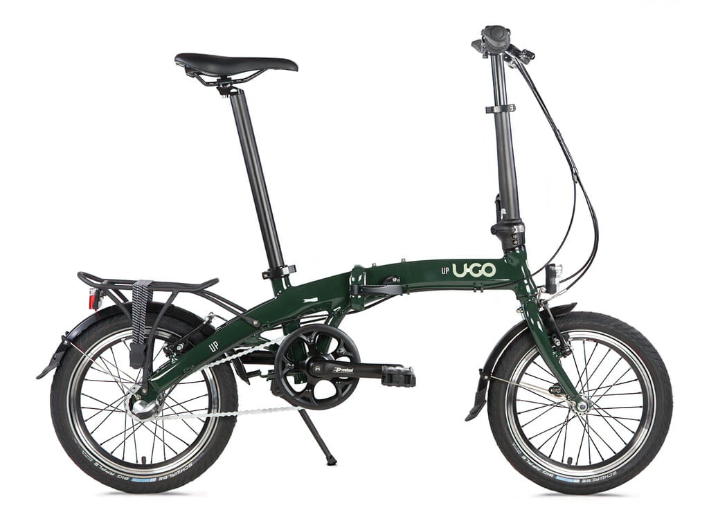 UGO i3 z kołami 16". Należy do najmniejszych rowerów dla dorosłych. Odpowiednie przełożenia powodują, że w czasie jazdy kręci się pedałami tyle samo co na większych rowerach. Przeznaczony jest dla osób, których droga do pracy lub szkoły wymaga dojścia do i od przystanku komunikacji - rowerem będzie szybciej. Złożony, mały rower łatwiej przewieźć zatłoczonym środkiem komunikacji a potem schować pod biurkiem lub zostawić w szatni. Ten model często jest wybierany na wyposażenie jachtów i kamperów, bo mimo małych kół, jest pełnosprawnym rowerem zajmującym niewiele miejsca. Jego trzybiegowa przerzutka schowana w piaście pozwala na szybką jazdę na większe odległości, odpowiednie opony na jazdę po piasku a pełna osłona łańcucha chroni ubranie przed zabrudzeniem. Wymiary po złożeniu: 69 x 66 x 33 cm. Wyposażony w błotniki i bagażnik aluminiowy, oraz oświetlenie bateryjne. Kolor ciemny zielony. UGO i3 16" jest odpowiednikiem modelu Dahon Curve i3 produkowanym pod marką własną holenderskiego dystrybutora rowerów Dahon.